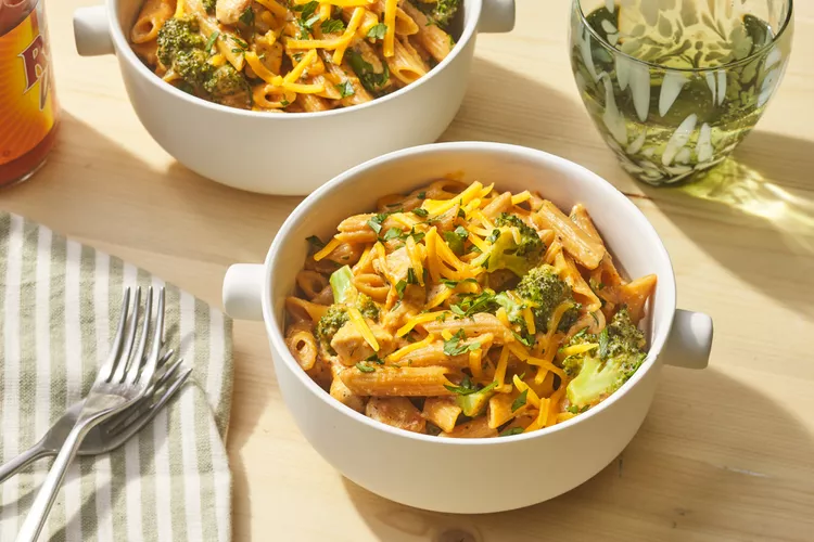 This easy one-pot mac & cheese recipe gets an extra boost of protein from chicken. Buffalo sauce adds spicy tang—look for one without added sugar, like Frank's RedHot.
