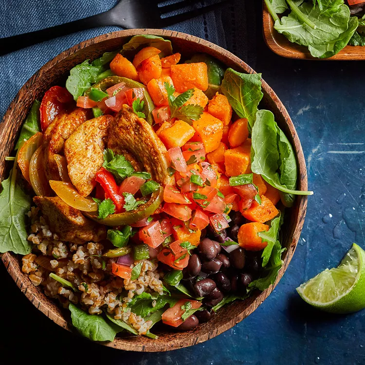 These satisfying bowls are chock-full of protein and fiber, thanks to chicken breast, black beans, sweet potatoes and bulgur—a versatile grain that has about 15 g fewer carbs (and more than twice the fiber) per cup than brown rice.