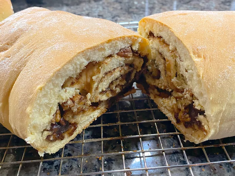 - Divide dough in half; roll each half into a 9x14-inch rectangle. Spread each rectangle with 1 tablespoon butter and sprinkle with 1/2 of the walnut mixture. Starting at the shorter end, roll each rectangle over filling and pinch seams to close.