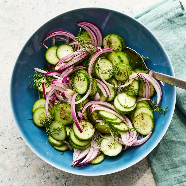 - Discard any liquid in the bowl and wipe it dry. Transfer the cucumbers to the bowl and toss with 1 cup onion, ¼ cup vinegar, 2 tablespoons dill and ¼ teaspoon pepper. Let stand at room temperature for 15 minutes. Serve immediately or refrigerate for up to 3 days.
