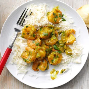 - In a large skillet, heat oil over medium-high heat. Add onion; cook and stir 1-2 minutes or until tender. Add shrimp; cook and stir 2 minutes. Add garlic and curry powder; cook and stir 30-60 seconds longer or until shrimp turn pink.
