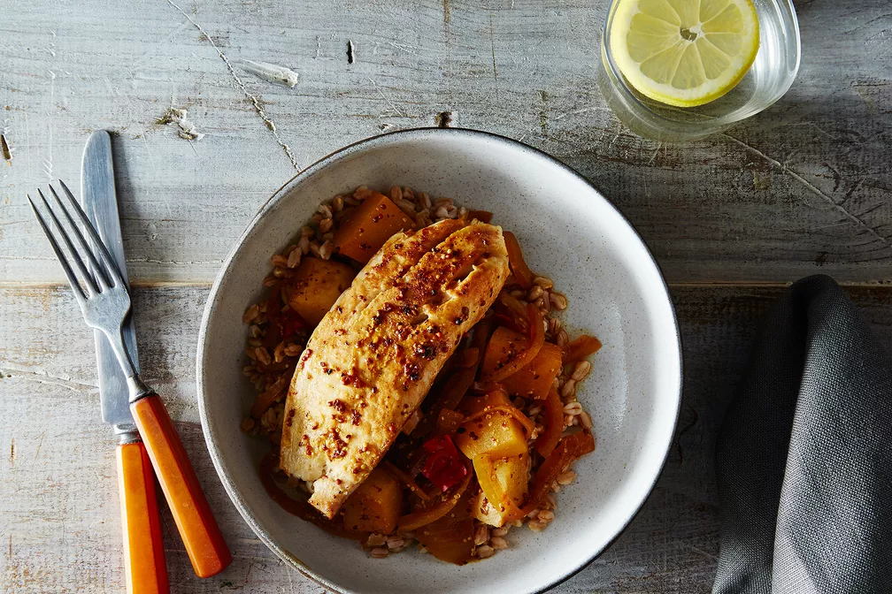 - Remove the onions from the marinade, and them add to the pan. Cook, stirring occasionally, until browned. Pour remaining marinade into the pan along with the broth. Nestle potatoes into the pan, cover, and simmer over medium-low heat, until potatoes are tender, roughly ten minutes. Add fish back to pan to warm. Serve over rice, quinoa, or another grain.
