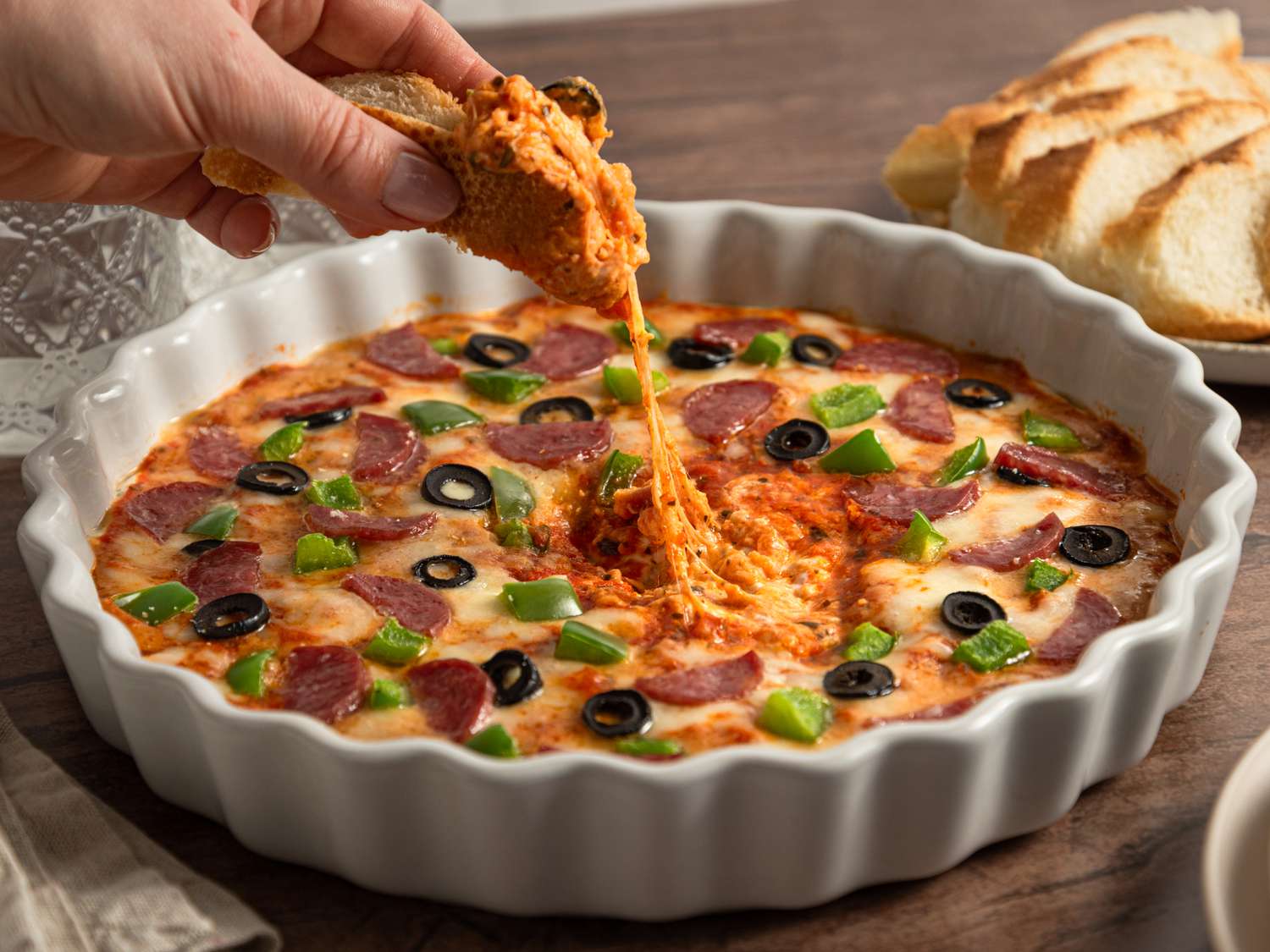 A cheesy, creamy dip layered with pizza sauce and toppings. Perfect for parties and game nights—just scoop with bread or chips.