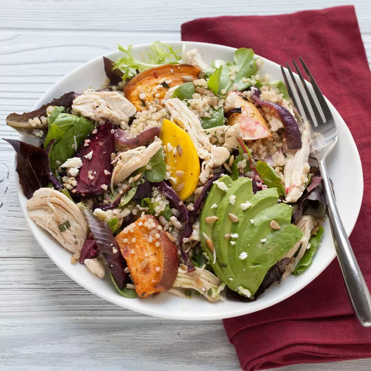 - Combine chicken, quinoa and roasted vegetables in a bowl; drizzle with vinaigrette. Top with avocado, feta and sunflower seeds.