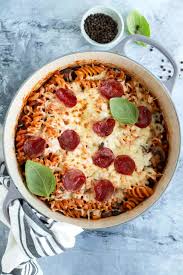 Pasta and pizza unite in this casserole-style dish featuring noodles, sauce, cheese, and toppings. Comfort food at its finest.