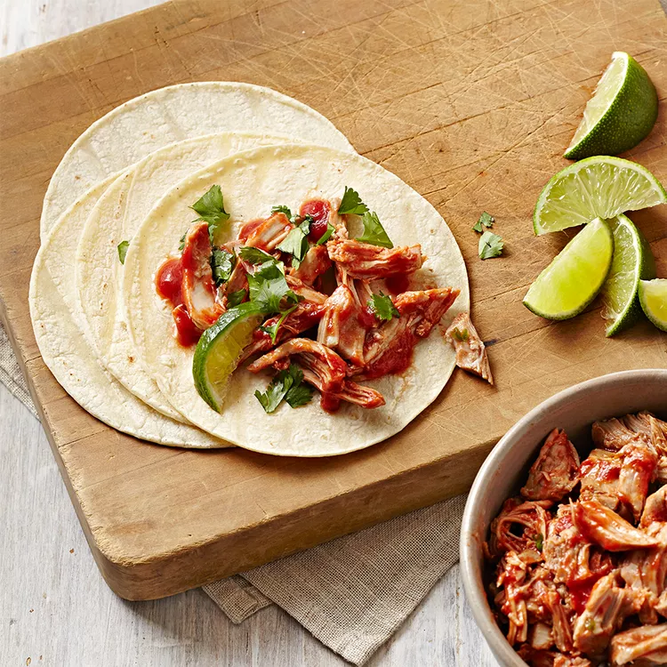 This taco recipe is a great choice for midweek dinners, even if it's not Taco Tuesday! We use moist boneless chicken thighs instead of beef. To make things easier for you, the taco filling is cooked in a slow cooker, so you can prepare it in the morning and come home to a delicious meal.