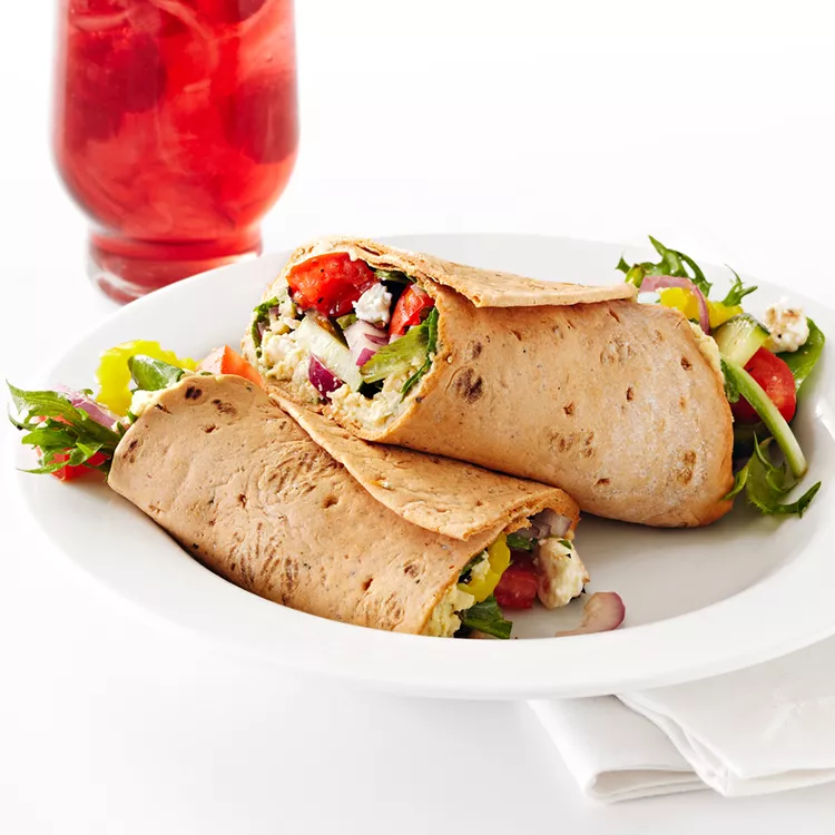 These healthy multi-grain wraps are filled with mixed greens, chopped cucumber, tomato and red onion, as well as feta cheese and a homemade cilantro hummus. As a time saver, the hummus can be prepared up to 3 days ahead, and chilled until you're ready to make the wraps.